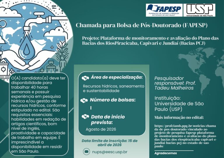 Chamada de pós-doutorado vinculado ao Projeto de Pesquisa FAPESP: Plataforma de monitoramento e avaliação do Plano das Bacias dos RiosPiracicaba, Capivari e Jundiaí (Bacias PCJ) no Estado de São Paulo
